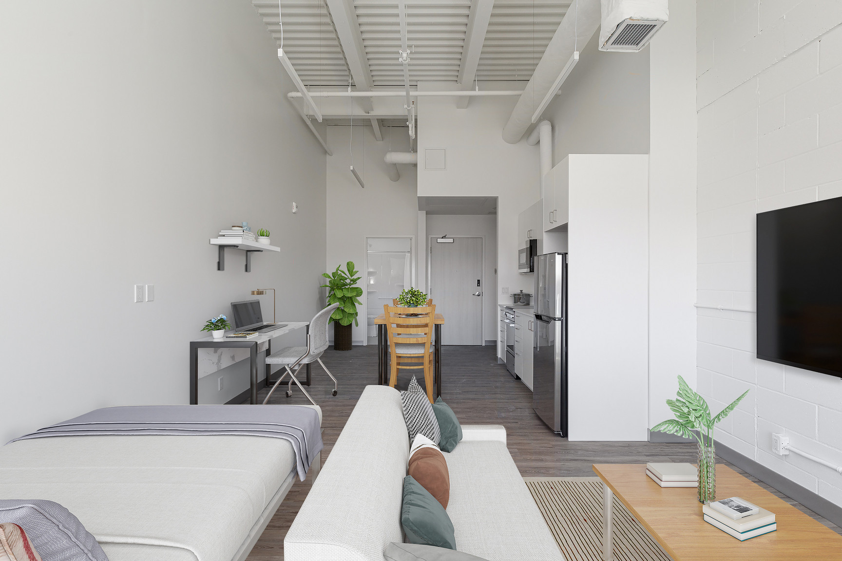 - Full XL bed, desk with a 32-inch smart TV in the bedroom