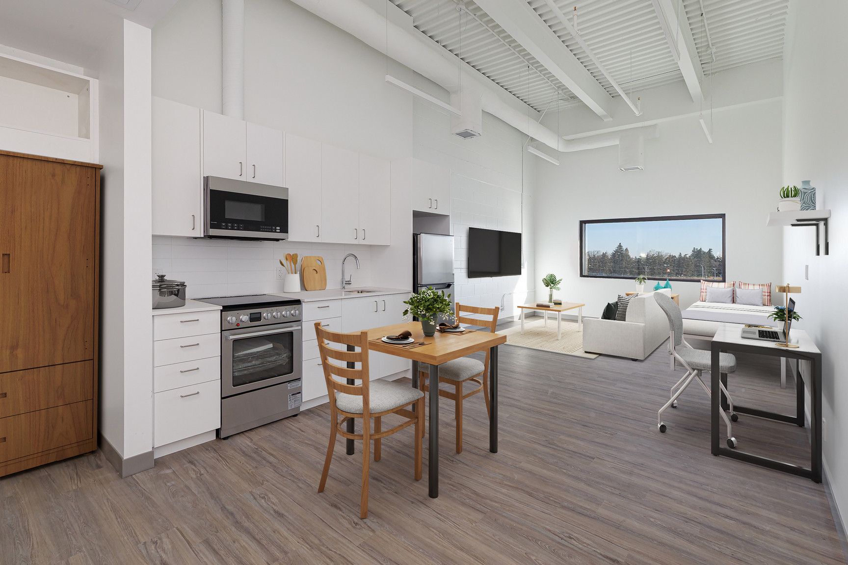- In-suite kitchens with stainless-steel appliances